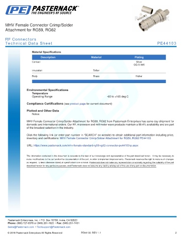 inventory and certifications: MHV Female Connector Crimp/Solder Attachment for RG59, RG62 PE44103