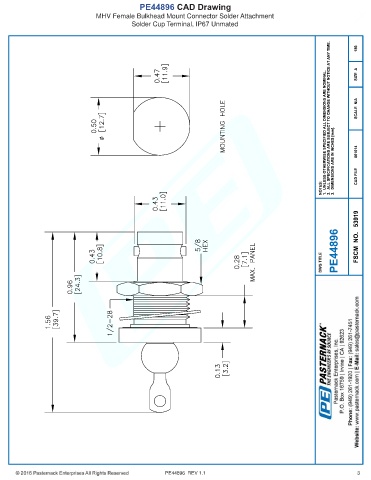 PE44896 CAD Drawing MHV Female Bulkhead Mount Connector Solder Attachment Solder Cup Terminal, IP67 Unmated PE44896 REV 1.1 3