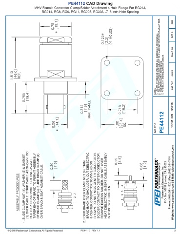 PE44112 CAD Drawing MHV Female Connector Clamp/Solder Attachment 4 Hole Flange For RG213, RG214, RG8, RG9, RG11, RG225, RG393, .718 inch Hole Spacing PE44112 REV 1.1 3