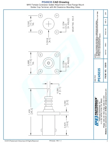 PE45035 CAD Drawing MHV Female Connector Solder Attachment 4 Hole Flange Mount Solder Cup Terminal, with #4 Clearance Mounting Holes PE45035 REV 1.1 3
