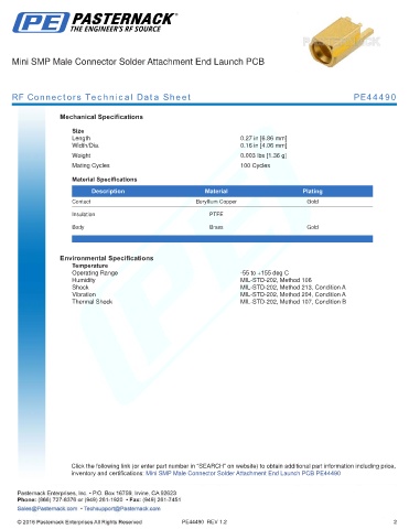 inventory and certifications: Mini SMP Male Connector Solder Attachment End Launch PCB PE44490
