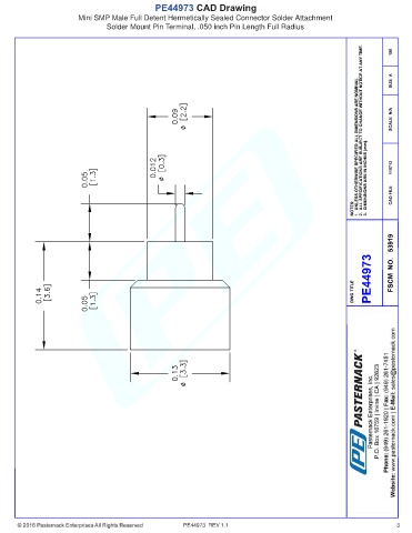 PE44973 CAD Drawing Mini SMP Male Full Detent Hermetically Sealed Connector Solder Attachment Solder Mount Pin Terminal, .050 inch Pin Length Full Radius PE44973 REV 1.1 3