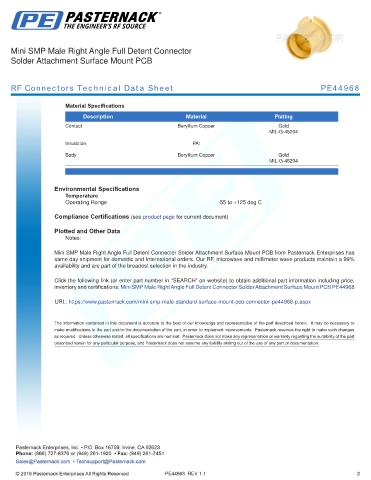 inventory and certifications: Mini SMP Male Right Angle Full Detent Connector Solder Attachment Surface Mount PCB PE44968