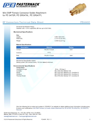 inventory and certifications: Mini SMP Female Connector Solder Attachment for PE-047SR, PE-SR047AL, PE-SR047FL