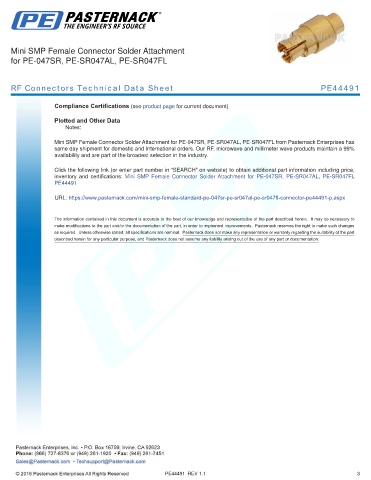 inventory and certifications: Mini SMP Female Connector Solder Attachment for PE-047SR, PE-SR047AL, PE-SR047FL
