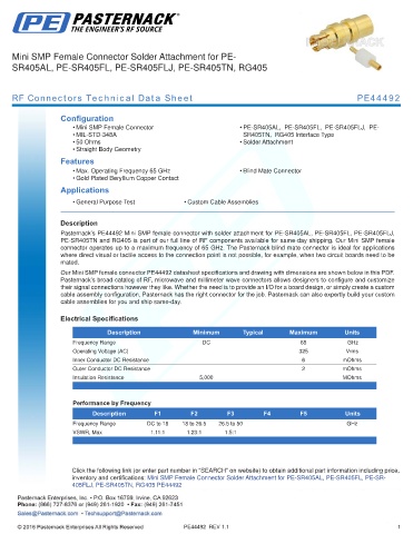 Pasternack’s PE44492 Mini SMP female connector with solder attachment for PE-SR405AL, PE-SR405FL, PE-SR405FLJ,