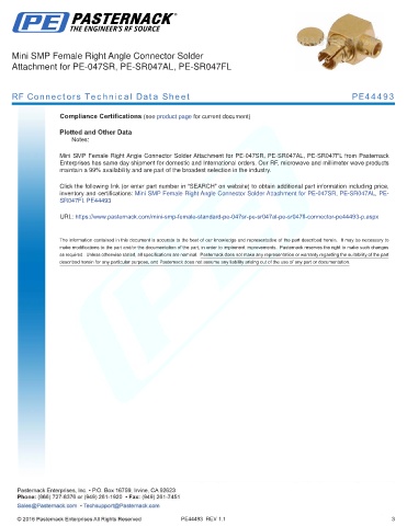 inventory and certifications: Mini SMP Female Right Angle Connector Solder Attachment for PE-047SR, PE-SR047AL, PE-