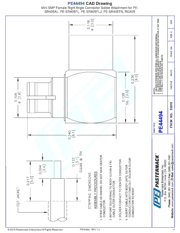 PE44494 CAD Drawing Mini SMP Female Right Angle Connector Solder Attachment for PE- SR405AL, PE-SR405FL, PE-SR405FLJ, PE-SR405TN, RG405 PE44494 REV 1.2 4