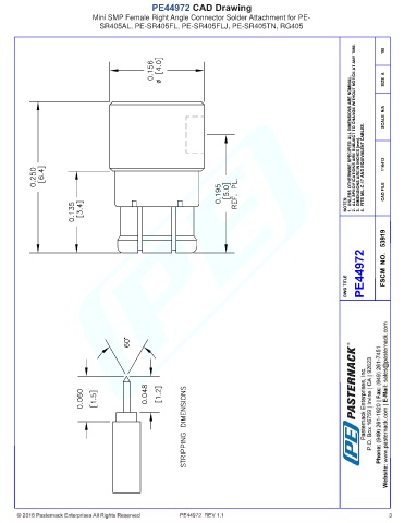 PE44972 CAD Drawing Mini SMP Female Right Angle Connector Solder Attachment for PE- SR405AL, PE-SR405FL, PE-SR405FLJ, PE-SR405TN, RG405 PE44972 REV 1.1 3
