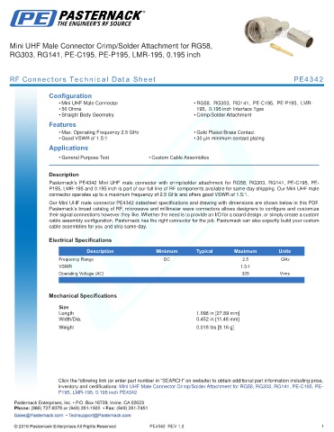 Our Mini UHF male connector PE4342 datasheet specifications and drawing with dimensions are shown below in this PDF.