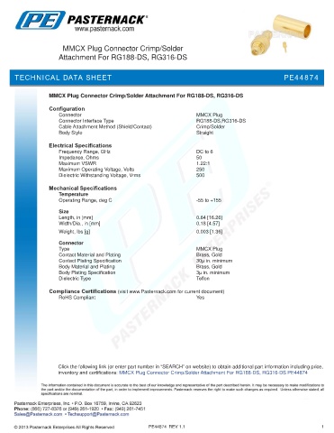 inventory and certifications: MMCX Plug Connector Crimp/Solder Attachment For RG188-DS, RG316-DS PE44874