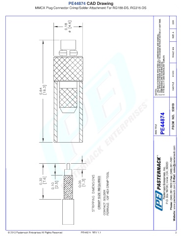 PE44874 CAD Drawing MMCX Plug Connector Crimp/Solder Attachment For RG188-DS, RG316-DS © 2013 Pasternack Enterprises All Rights Reserved PE44874 REV 1.1 3