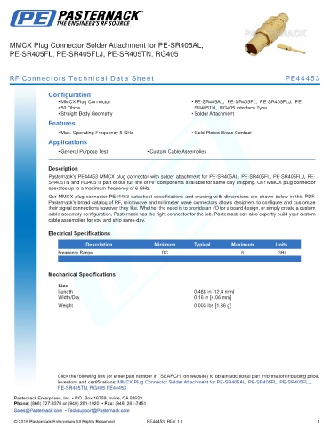 Pasternack’s PE44453 MMCX plug connector with solder attachment for PE-SR405AL, PE-SR405FL, PE-SR405FLJ, PE-