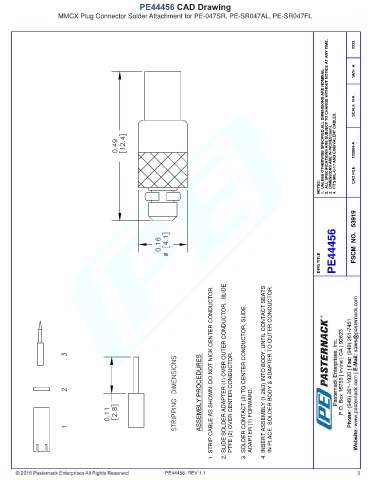 ASSEMBLY PROCEDURES 1. STRIP CABLE AS SHOWN. DO NOT NICK CENTER CONDUCTOR. 2. SLIDE SOLDER ADAPTER (1) OVER OUTER CONDUCTOR. SLIDE PTFE (2) OVER CENTER CONDUCTOR. 3. SOLDER CONTACT (3) TO CENTER CONDUCTOR. SLIDE ADAPTER (1) FORWARD. 4. INSERT ASSEMBLY (1,2&3) INTO BODY, UNTIL CONTACT SEATS IN PLACE. SOLDER BODY & ADAPTER TO OUTER CONDUCTOR.