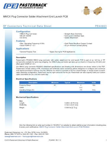 Pasternack’s PE44663 MMCX plug connector with solder attachment for end launch PCB is part of our full line of RF