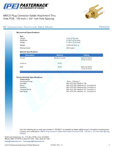 inventory and certifications: MMCX Plug Connector Solder Attachment Thru Hole PCB, .100 inch x .031 inch Hole Spacing