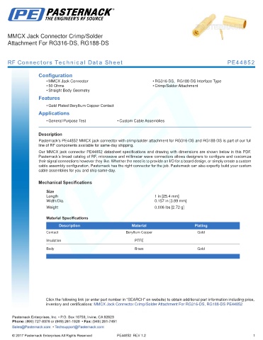 Pasternack’s PE44852 MMCX jack connector with crimp/solder attachment for RG316-DS and RG188-DS is part of our full