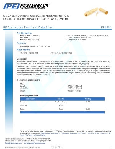Pasternack’s PE4901 MMCX jack connector with crimp/solder attachment for RG174, RG316, RG188, 0.100 inch, PE-B100,
