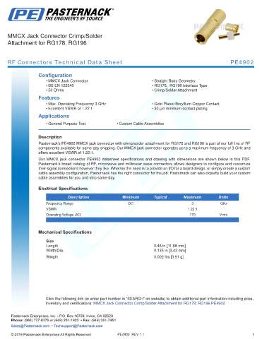 inventory and certifications: MMCX Jack Connector Crimp/Solder Attachment for RG178, RG196 PE4902