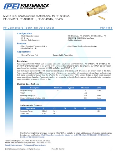 Pasternack’s PE44458 MMCX jack connector with solder attachment for PE-SR405AL, PE-SR405FL, PE-SR405FLJ, PE-