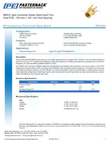 Pasternack’s PE4904 MMCX jack connector with solder attachment for thru hole PCB (.100 inch x .031 inch hole spacing) is