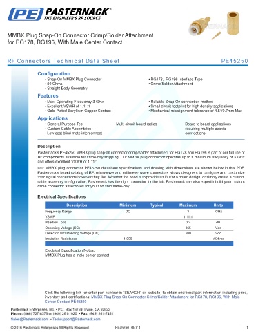 Pasternack’s PE45250 MMBX plug snap-on connector crimp/solder attachment for RG178 and RG196 is part of our full line of