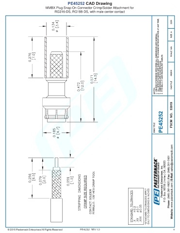 PE45252 CAD Drawing MMBX Plug Snap-On Connector Crimp/Solder Attachment for RG316-DS, RG188-DS, with male center contact PE45252 REV 1.0 4
