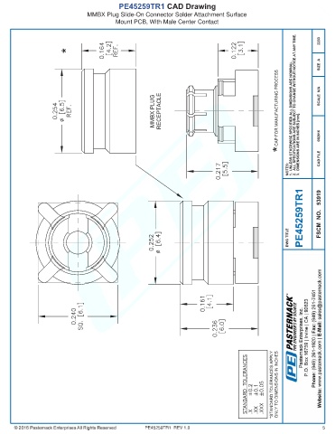 PE45259TR1 CAD Drawing MMBX Plug Slide-On Connector Solder Attachment Surface Mount PCB, With Male Center Contact PE45259TR1 REV 1.0 5