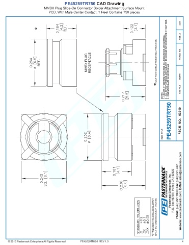 PE45259TR750 CAD Drawing MMBX Plug Slide-On Connector Solder Attachment Surface Mount PCB, With Male Center Contact, 1 Reel Contains 750 pieces PE45259TR750 REV 1.0 4