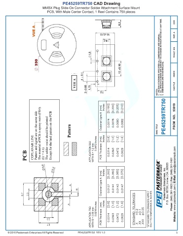 PE45259TR750 CAD Drawing MMBX Plug Slide-On Connector Solder Attachment Surface Mount PCB, With Male Center Contact, 1 Reel Contains 750 pieces PE45259TR750 REV 1.0 5