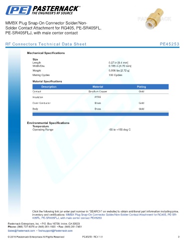 inventory and certifications: MMBX Plug Snap-On Connector Solder/Non-Solder Contact Attachment for RG405, PE-SR-