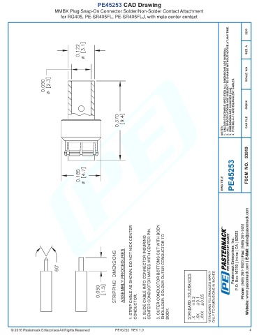 PE45253 CAD Drawing MMBX Plug Snap-On Connector Solder/Non-Solder Contact Attachment for RG405, PE-SR405FL, PE-SR405FLJ, with male center contact PE45253 REV 1.0 4