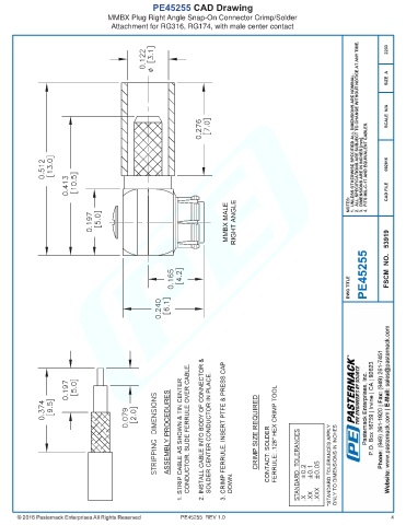 PE45255 CAD Drawing MMBX Plug Right Angle Snap-On Connector Crimp/Solder Attachment for RG316, RG174, with male center contact PE45255 REV 1.0 4