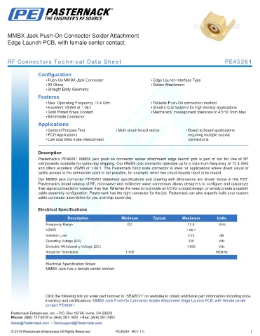 Pasternack’s PE45261 MMBX jack push-on connector solder attachment edge launch pcb is part of our full line of RF