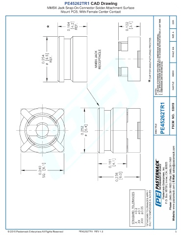 PE45262TR1 CAD Drawing MMBX Jack Snap-On Connector Solder Attachment Surface Mount PCB, With Female Center Contact PE45262TR1 REV 1.0 5
