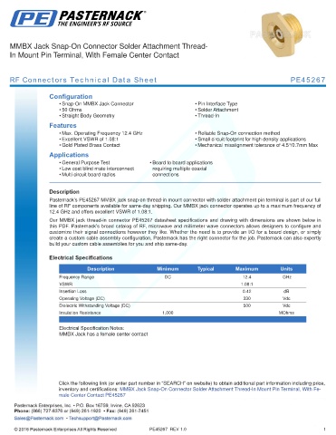 Pasternack’s PE45267 MMBX jack snap-on thread-in mount connector with solder attachment pin terminal is part of our full