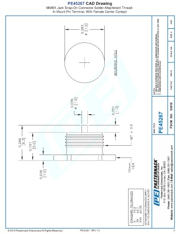 PE45267 CAD Drawing MMBX Jack Snap-On Connector Solder Attachment Thread- In Mount Pin Terminal, With Female Center Contact PE45267 REV 1.0 4