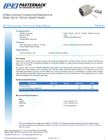 Pasternack’s PE4042 type N male connector with crimp/crimp attachment for RG55, RG141, RG142, RG223 and RG400 is