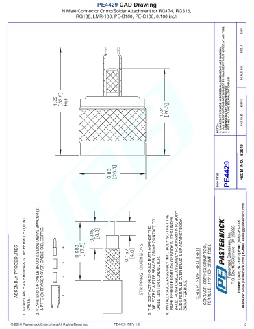 PE4429 CAD Drawing N Male Connector Crimp/Solder Attachment for RG174, RG316, RG188, LMR-100, PE-B100, PE-C100, 0.100 inch PE4429 REV 1.2 3