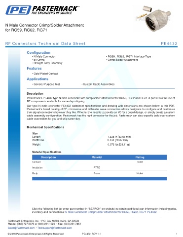 inventory and certifications: N Male Connector Crimp/Solder Attachment for RG59, RG62, RG71 PE4432