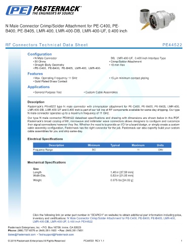 Pasternack’s PE44522 type N male connector with crimp/solder attachment for PE-C400, PE-B400, PE-B405, LMR-400,