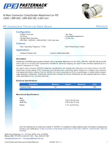 Our type N male connector PE44523 datasheet specifications and drawing with dimensions are shown below in this PDF.