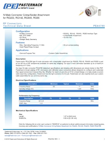 inventory and certifications: N Male Connector Crimp/Solder Attachment for RG223, RG142, RG400, RG55 PE44788 -