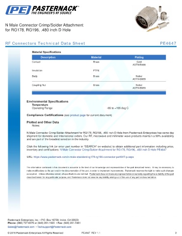 inventory and certifications: N Male Connector Crimp/Solder Attachment for RG178, RG196, .480 inch D Hole PE4647