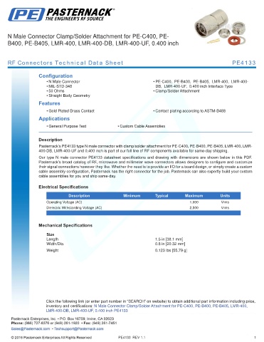 Pasternack’s PE4133 type N male connector with clamp/solder attachment for PE-C400, PE-B400, PE-B405, LMR-400, LMR-