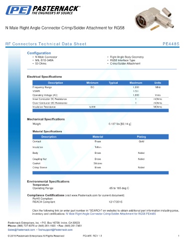 inventory and certifications: N Male Right Angle Connector Crimp/Solder Attachment for RG58 PE4485