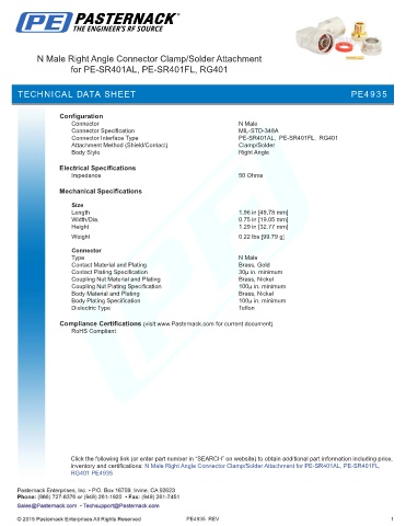 inventory and certifications: N Male Right Angle Connector Clamp/Solder Attachment for PE-SR401AL, PE-SR401FL,