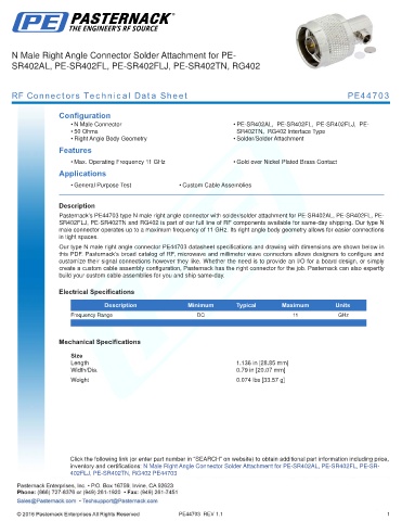 inventory and certifications: N Male Right Angle Connector Solder Attachment for PE-SR402AL, PE-SR402FL, PE-SR-