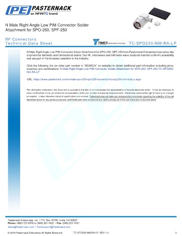 any representation or warranty regarding the suitability of the part described herein for any particular purpose, and Pasternack does not assume any liability arising out of the use of any part or documentation.