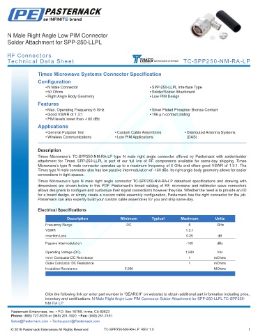 inventory and certifications: N Male Right Angle Low PIM Connector Solder Attachment for SPP-250-LLPL TC-SPP250- -
